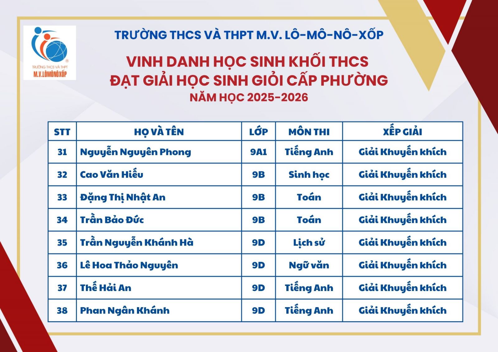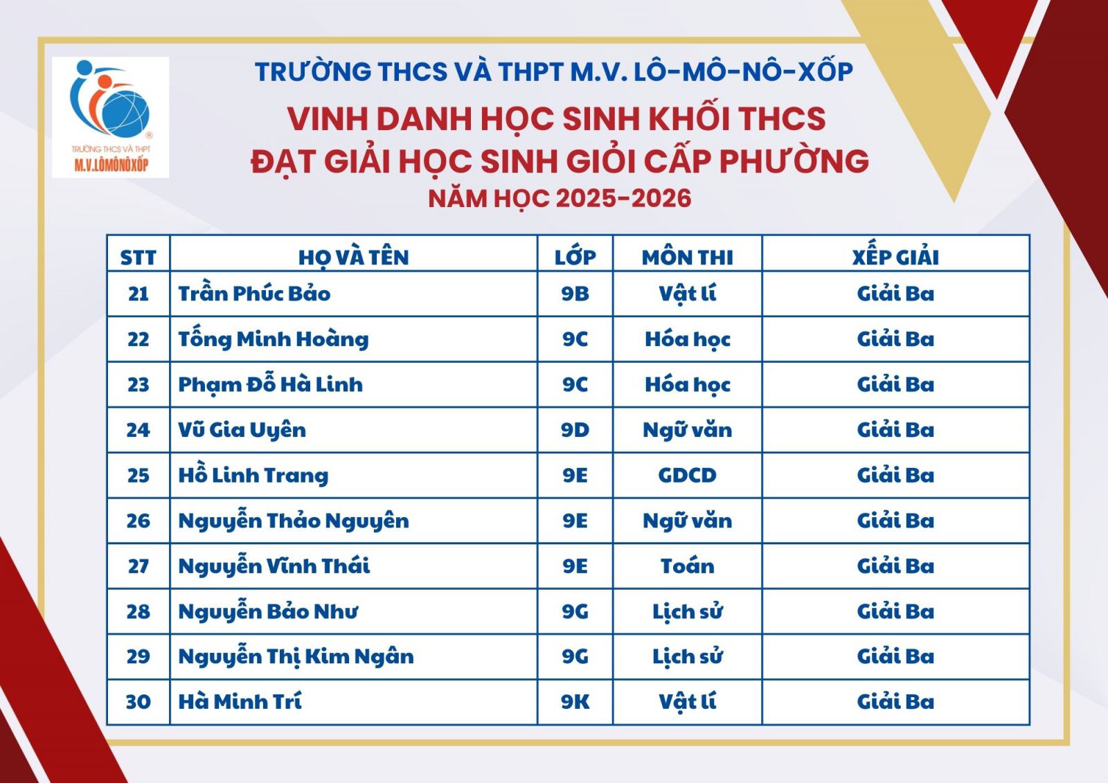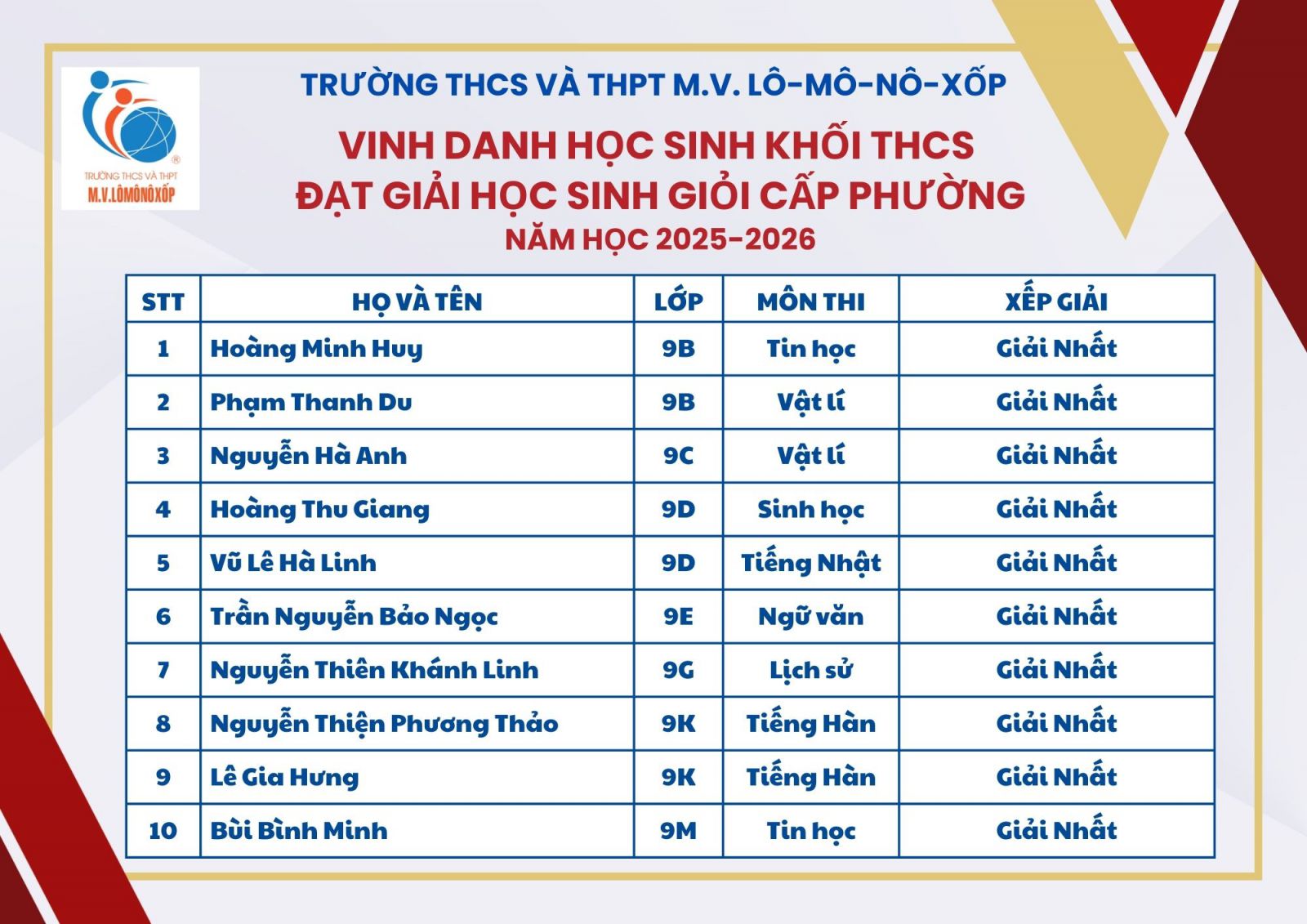 Trường THCS và THPT M.V. Lô-mô-nô-xốp trân trọng chúc mừng các em học sinh đã đạt thành tích xuất sắc trong Kỳ thi học sinh giỏi cấp Phường Từ Liêm, thành phố Hà Nội năm học 2025–2026.