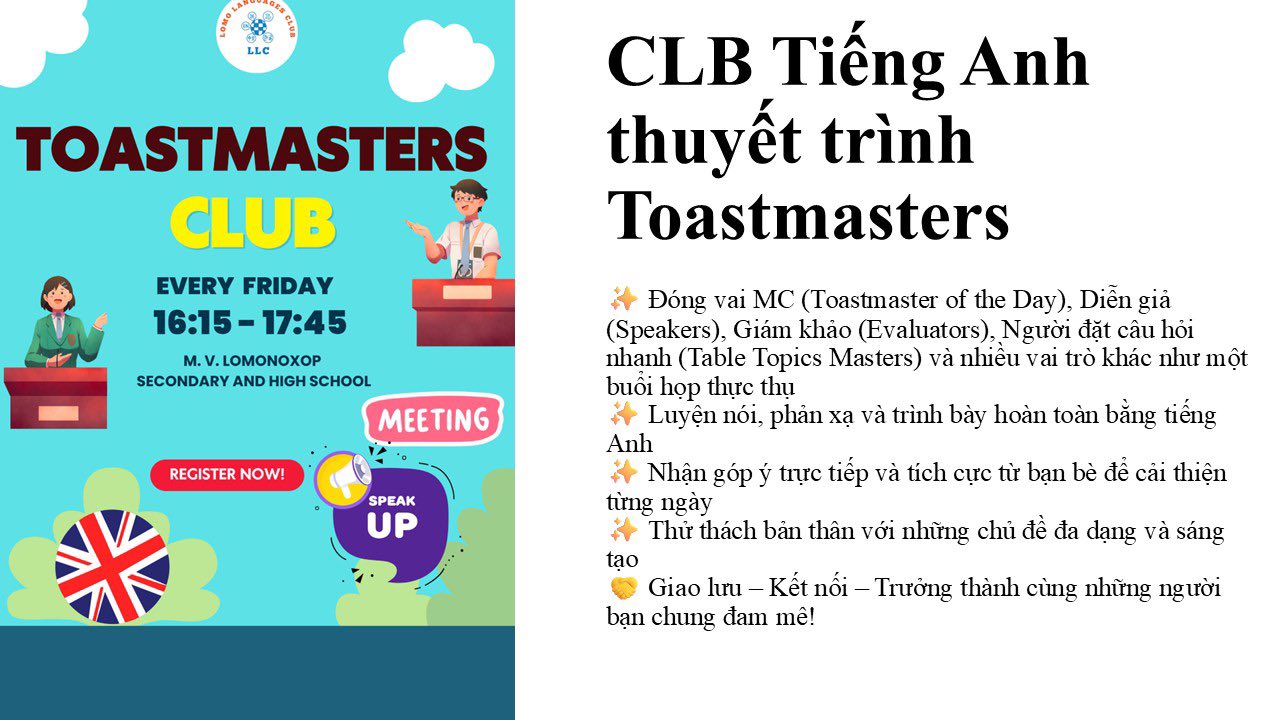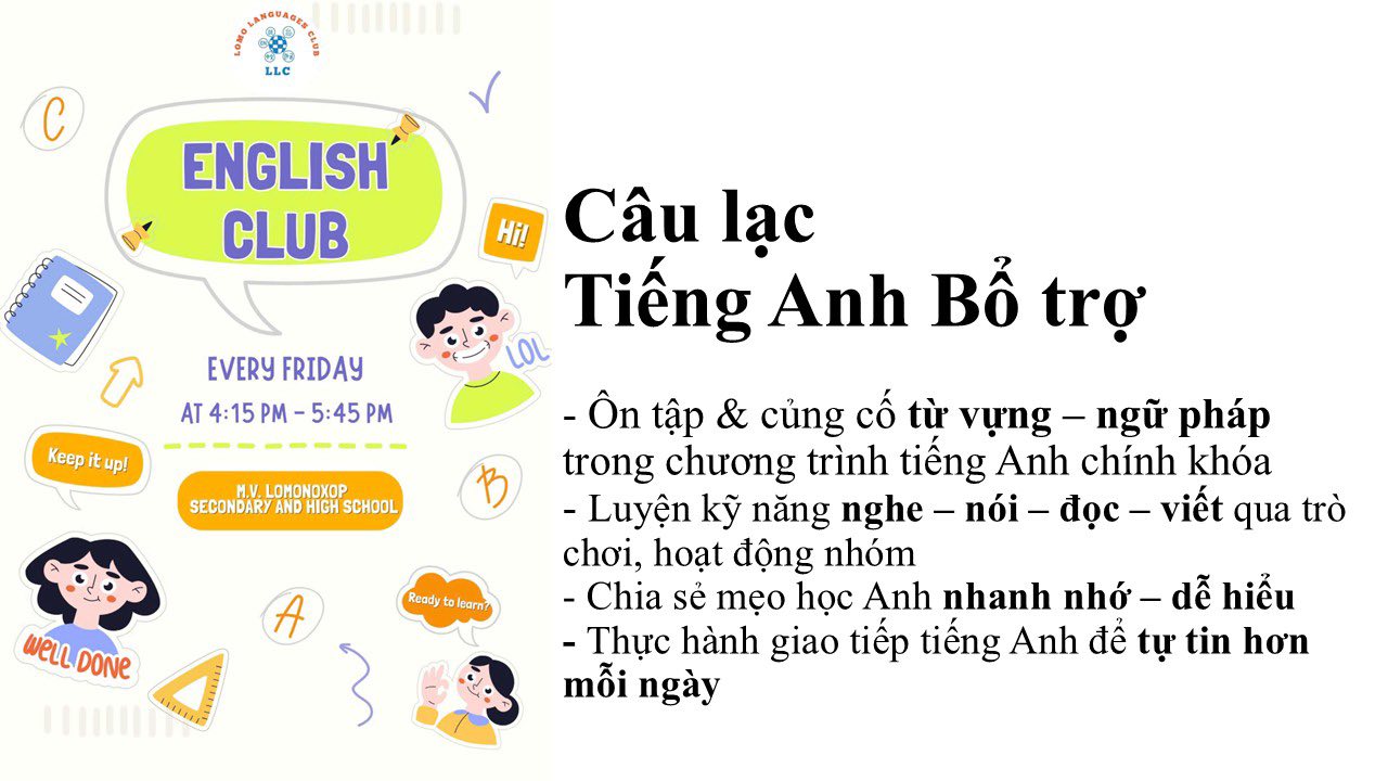 Trong không khí vui tươi, phấn khởi của những ngày tháng 9 đầy hào hùng và mang đậm tinh thần yêu nước, hiếu học, CLB Ngoại ngữ hoà chung niềm vui đó, chào đón các thành viên mới tham gia vào các CLB Lomo Toastmasters, CLB tiếng Anh Bổ trợ, CLB Lomo IELTS Nextgen, CLB tiếng Đức, Nhật, Hàn, Trung. Nơi đây là không gian đa văn hoá, giúp các em học sinh được đắm mình với những ngôn ngữ mà các em yêu thích hứa hẹn sẽ mang tới những sáng tạo đột phá, trang bị những kiến thức mới mẻ đa dạng là hành trang giúp các em trở thành công dân toàn cầu.
