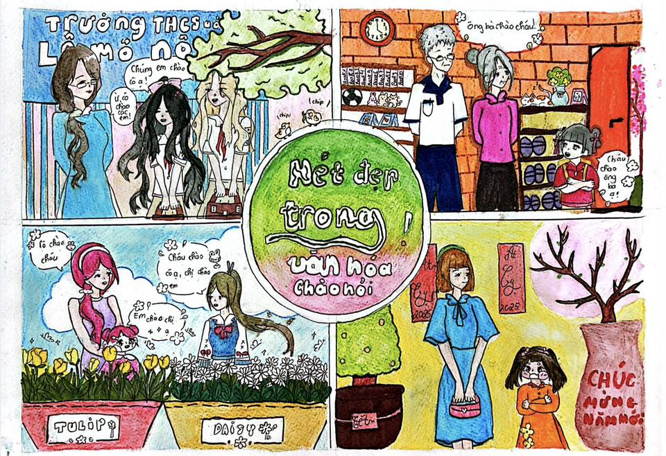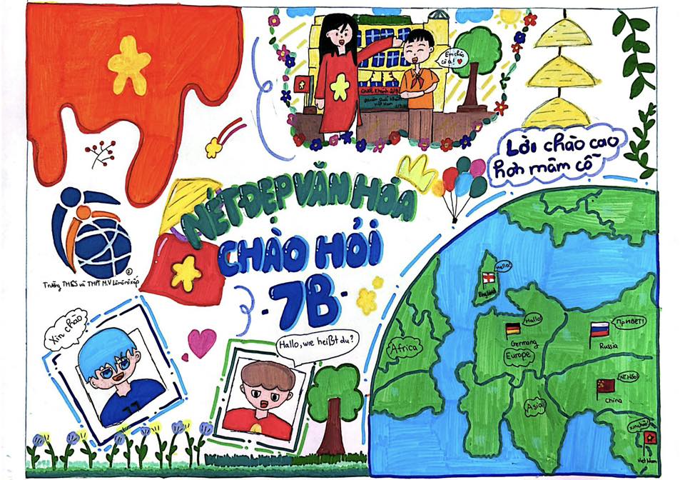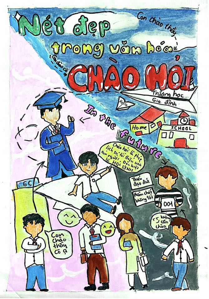 Khối 6, 7 – Những “họa sĩ nhí” đã khắc hoạ “Nét đẹp trong văn hoá chào hỏi” bằng những bức tranh rực rỡ sắc màu, nơi từng nụ cười, ánh mắt đều toát lên sự lễ phép, thân thiện.