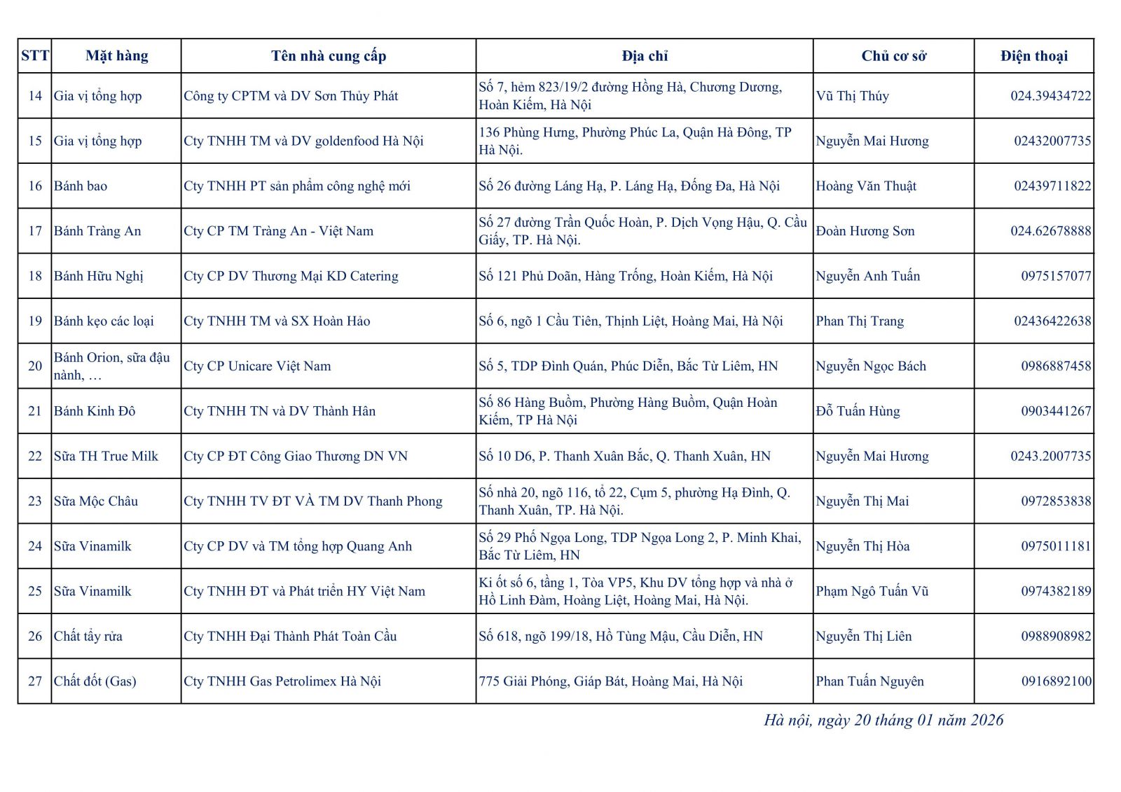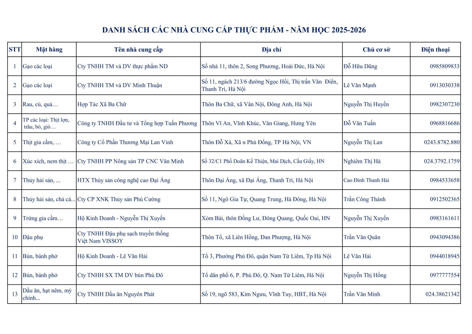 Danh sách các nhà cung cấp thực phẩm năm học 2025-2026