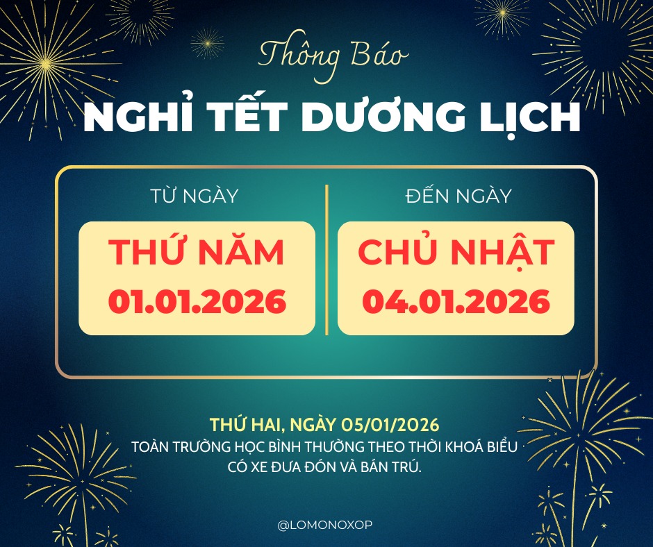 Bởi vậy, trường THCS và THPT M.V. Lô-mô-nô-xốp nghỉ tết dương lịch 04 ngày, gồm các ngày 01/01/2026, 02/01/2026, 03/01/2026 và 04/01/2026.