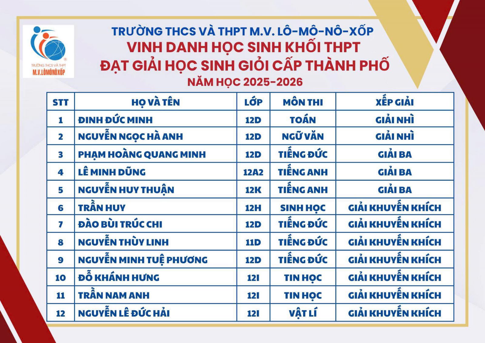 Trường THCS và THPT M.V. LÔ-MÔ-NÔ-XỐP tự hào chúc mừng 12 học sinh khối THPT đã xuất sắc đạt giải trong Kỳ thi Học sinh giỏi cấp Thành phố Hà Nội năm học 2025–2026, gồm: